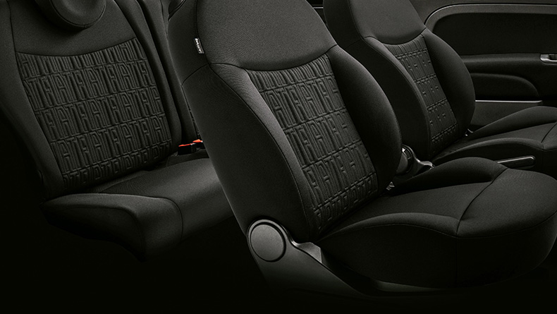 Installez-vous confortablement sur les sièges en tissu noir fabriqués à partir de PET recyclé et portant le monogramme Fiat. Durable jusque dans les moindres détails.